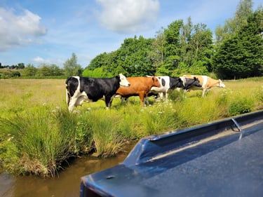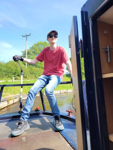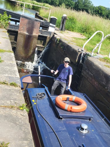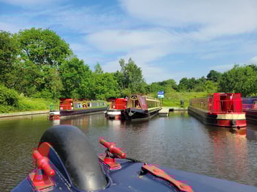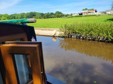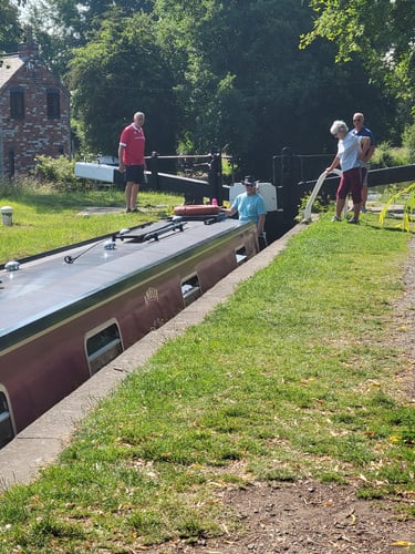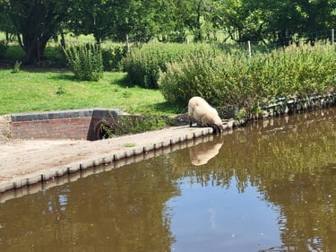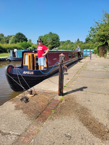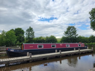 Elesmere is a great spot to refill your water tank and get rid of trash. After you refill, you move out of the way so other boats can do the same. We drove down along the right side of the canal, opposite a farmer's field with cows, and parked there for the night. We walked into the town. It was only a 10-minute walk. There is a Tesco grocery store and several restaurants. We ate at the Thai Mere restaurant. It was delicious! Highly recommend! Then, we took a nice walk back to our boat for showers and relaxation.